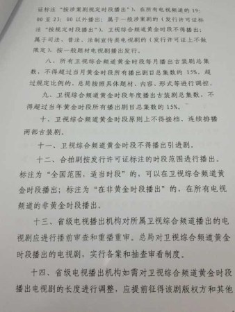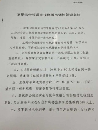 这项名为《卫视综合频道电视剧播出调控管理办法》的文件中,首先对电视剧播出总量、范围、题材、时机、时段等做出限定。在播出量上,要求除法定节假日外,卫视综合频道电视剧播出时间不得超过播出总量的45%;每日播出同一部电视剧总集数(包括重播集数)不得超过6集,双休日不得超过8集。播出时段上,要求19点至24点之间播出同一部电视剧的总集数(包括重播集数)不得超过3集;黄金时段(19点至22点)播出同一部电视剧的频道数量不得超过四家。