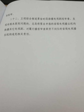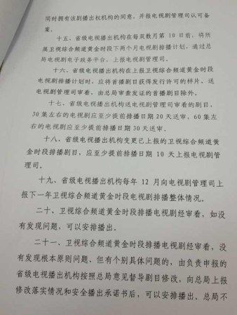 文件中还明确了电视剧的播出和审查程序,规定:升级电视播出机构对所属卫视综合频道播出的电视剧需进行播前审查和重播重审,总局对卫视综合频道黄金时段播出的电视剧实行备案和抽查审看制度;电视剧播出长度调整时,应提前征得该剧版权方和其他同时拥有该剧播出权机构的同意;省级播出机构需在每双数月第10日前将所属频道黄金时段下两月电视剧排播计划上报,每年12月将下一年排播整体情况上报,变更排播剧目需在排播日期前10天上报;上报播出计划时应同时提交样片以供审看,经审无原则性问题但有个别具体问题的,在按总局意见修改后可安排播出,有根本原则问题的,则必须换播其它电视剧,并将追究播前审查不到位的省级电视播出机构的相关责任。