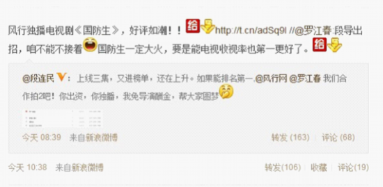 《国防生》在风行网上的热播让众多粉丝参与互动,在网络上设计人物大结局并呼吁《国防生》第二部的拍摄。受此鼓舞,段连民在微博上写道:“上线三集,又进榜单,还在上升。如果能排名第一,@风行网@罗江春:我们合作拍2吧!你出资,你独播,我免导演酬金,帮大家圆梦。”风行网CEO罗江春则回应:“段导出招,咱不能不接着。”