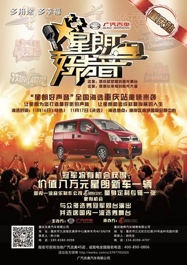 据悉,此前“星朗好声音”在成都、潍坊、洛阳、苏州等地的选拔都已圆满落幕,各地三强选手纷纷获得丰厚的奖品并与来自《星光大道》、《中国好声音》、《我的中国星》、《中国梦之声》、《中国最强音》等选秀明星同台飙歌。特别是“星朗好声音”各站冠军选手都获赠一辆广汽吉奥今年新推出价值8万元的星朗MPV汽车一辆。亚军获iPhone 5c一部,季军获ipad mini一部。主办方透露,海选中的优秀选手,除有机会登上冠军演唱会舞台外,还将获得国韵文化为其量身制作EP一张,并推荐到电视选秀舞台。