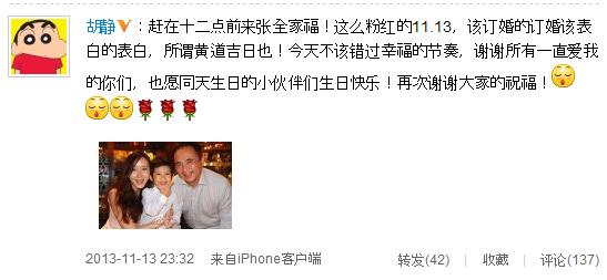 11月13日是内地女星胡静35岁生日。晚上11时许,胡静在微博晒出全家福,称不错过11.13这一天幸福的节奏。