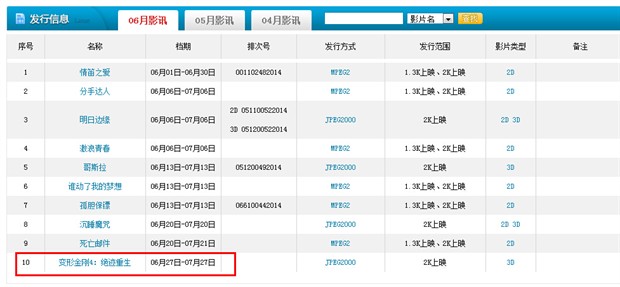 《变形金刚4:绝迹重生》将于6月27日公映,中国内地和北美同步。据中影公司的官网上发布的消息,《变形金刚4》的发行信息已经公布:以2K的规格上映,即每格画面的分辨率达到2048×1080,是目前主流的放映规格,影片的类型为3D。电影首个密钥的使用时间是6月27日至7月27日,为期一个月,密钥到期后,片方可申请延长。