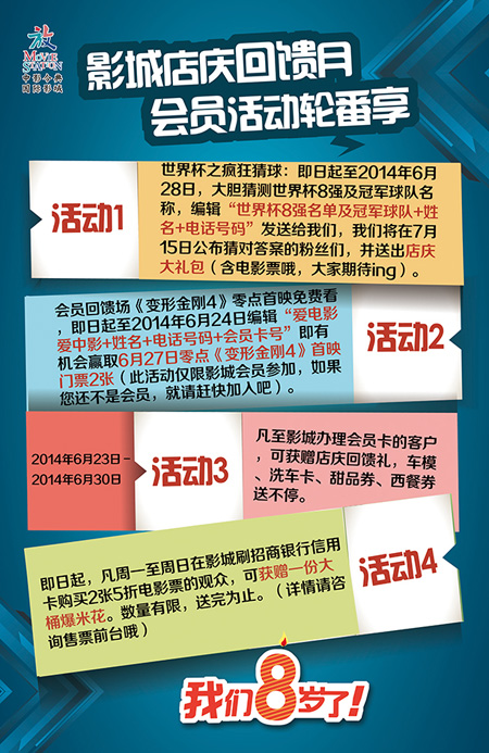 世界杯之疯狂猜球:即日起至2014年6月28日,大胆猜测世界杯8强及冠军球队名称,编辑“世界杯8强名单及冠军球队+姓名+电话号码”发送给我们,我们将在7月15日公布猜对答案的粉丝们,并送出店庆大礼包(含电影票哦,大家期待ing)。