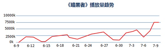 改编自誉为“中国东野圭吾”的悬疑小说家周浩晖同名小说的《暗黑者》,是一部按照美剧形式拍摄的国产季播悬疑剧,延续了原著的“暗黑哥特风”。该剧的美剧范儿让《暗黑者》在众多网剧中独树一帜,迅速吸引了网友的追看热情。在腾讯视频的播放量一路走高。数据显示,自6月10日该剧首播当日单集点击破百万,不到3周,播放量突破4000万,随着剧情的深入,用户对剧集的粘性越来越高,7月9日,播放量达到7500万,到7月11日,播放量成功破亿。