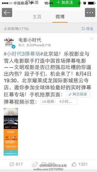 8月1日,《小时代》官方微博“电影小时代”发文称将于8月4日举办全国首场弹幕电影,并自称是全球体验最好的实时弹幕。随后便被秦迷发现质疑:《秦时明月之龙腾万里》早在7月31日便举办了弹幕电影,受到了观众的一致好评,新闻也被广泛传播,怎么首场的头衔反倒被《小时代》拿去了呢?