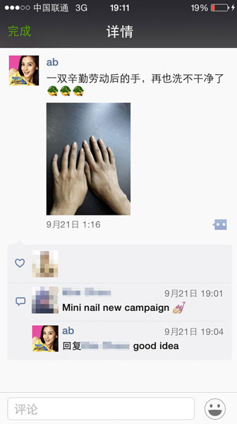此外,baby还在朋友圈晒出自己双手的一张照片。照片中,baby两手发黑,指甲里全是黑泥,文字中她提到,“一双辛勤劳动后的手,再也洗不干净了。”据知情者透露,这是《奔跑吧兄弟》在舟山录制过程中,baby滚泥潭之后留下的痕迹。看来,随着任务难度的升级,女神也是越来越拼了。