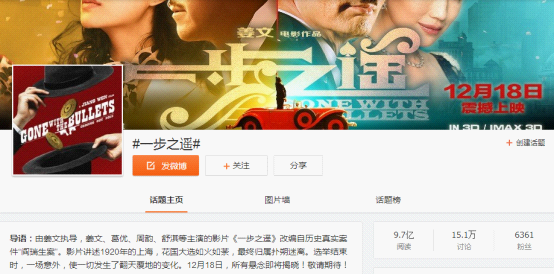 作为首位使用IMAX 3D摄影机的中国导演,首部使用IMAX摄影机参与拍摄部分精彩场景的华语电影,《一步之遥》从演员阵容、场景设置到顶尖的电影技术运用都堪称国产电影翘楚。姜文四年磨一剑,“四王二后”的华丽阵容,《一步之遥》还未上映已经火爆全国,首映门票一票难求,关于《一步之遥》的热议长期在微博、微信等社交网站和门户话题榜居于首位,网上各种《一步之遥》的活动更是为姜文这部影片点燃催化剂,可以说是万众期待,只等这部IMAX3D版的《一步之遥》绚丽绽放。以新浪微博#IMAX3D一步之遥#和#一步之遥#两个话题为例,阅读量将近11亿,有20多万人参与讨论,可见影迷对这部影片的期待程度。