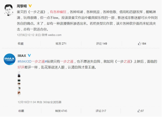 当今社会下,社会化营销越来越重要,随着各种社交网站的应用推广,每个普通人都是一个自媒体,不断发出自己的声音。而对于电影来看,片方宣传、网络媒体、普通影迷都积极表达自己的观点,从一步之遥未映先火到首映后差评云集,再到网上诸多解读后的口碑逆袭,无不表明社交媒体上的口碑对电影票房具有直接的推动作用。笔者看到微博上一则IMAX和爱奇艺的微博活动竟然有将近三万的转评量,足以看出网络营销的重要性。在移动互联网和社交化媒体充分渗透的今天,善用社交媒体,做好整合营销,对于产品的扩散传播可以说有着事半功倍的功效。