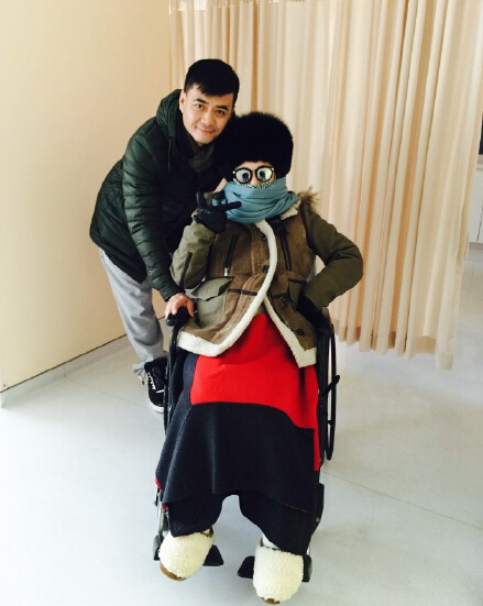 照片中,坐在轮椅上的秦海璐被包裹得十分严实,身上不仅盖着毯子,还穿着厚外套、厚拖鞋,围着大围巾,并戴着厚帽子,老公王新军在她身旁为其推轮椅。