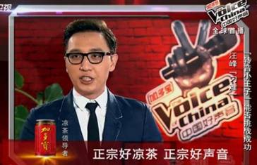 江湖上传言,加多宝冠名第一季《中国好声音》只花了6000万,但是却收获了一档连续三年收视冠军的现象级节目。抛开节目顶级制作精良品质、抛开吴莫愁等话题选手、抛开杨坤神奇的32不谈,主持人华少43秒350个字的口播,也成为这个节目最为人所津津乐道的经典桥段。“正宗好凉茶正宗好声音欢迎收看由凉茶领导品牌加多宝为您冠名的加多宝凉茶中国好声音。”冠名商加多宝也因为这句神语速的广告语,在品牌切换的关键时期,伴随着节目的高收视率进入千家万户,很多网站甚至推出华少口播神语速PK赛。 | |