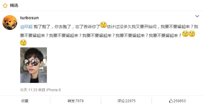3月13日上午,孙俪在微博中晒出刚剪完头发的照片,并附文@老公邓超,称:“剪了剪了,你去跑了,忘了告诉你了。估计过没多久我又要开始问,我要不要留起来?我要不要留起来?我要不要留起来?我要不要留起来?我要不要留起来?我要不要留起来?”