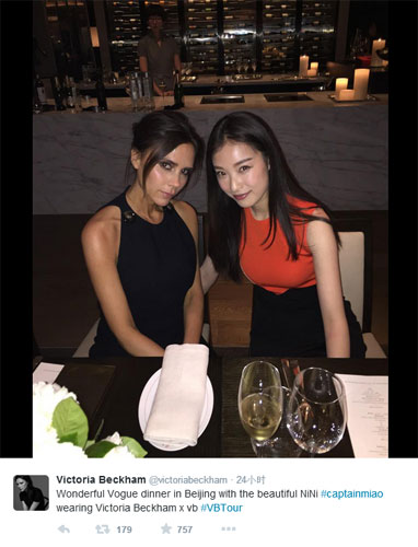 近日,“贝嫂”维多利亚-贝克汉姆(Victoria Beckham)空降中国,参加某时尚晚宴。3月17日,维多利亚在自己的社交工具中晒出于中国女星倪妮的合照,两国女神斗艳。维多利亚称赞了此次在北京的时尚晚宴,并亲昵称倪妮为“beautiful NiNi(美丽的倪妮)”。
