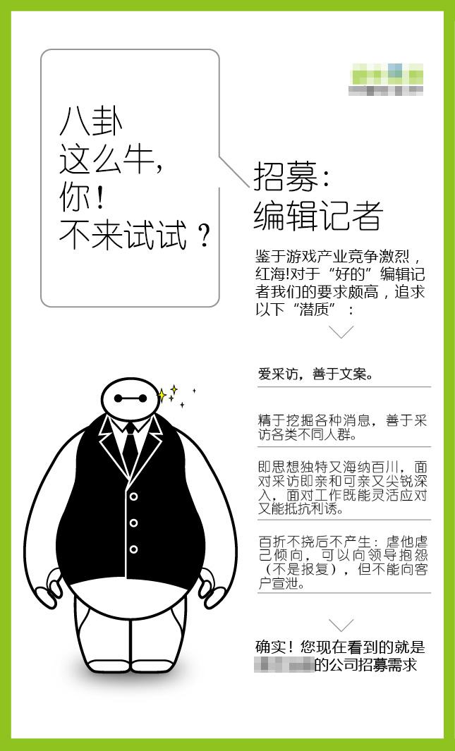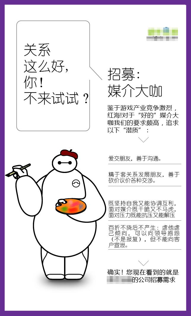 从已经曝光的十组海报中可以看到,该公司招募员工对各个方面都有严格要求。其中一条要求员工“百折不挠后不产生:虐他虐己倾向,可以向领导抱怨,但不能向客户宣泄”,虽然文字调侃,但可以看出对员工心理素质和对人态度的严格要求。更不用说其对不同岗位员工的专业水准要求,简直称的上是吹毛求疵啊!