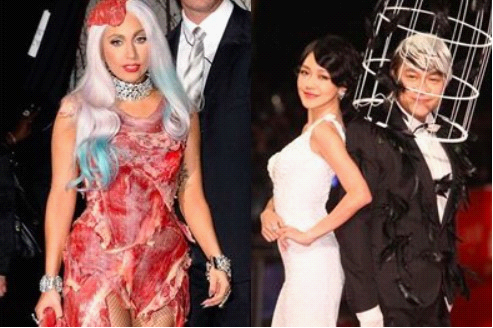左:ladygaga鲜肉装 右:蔡康永鸟笼装