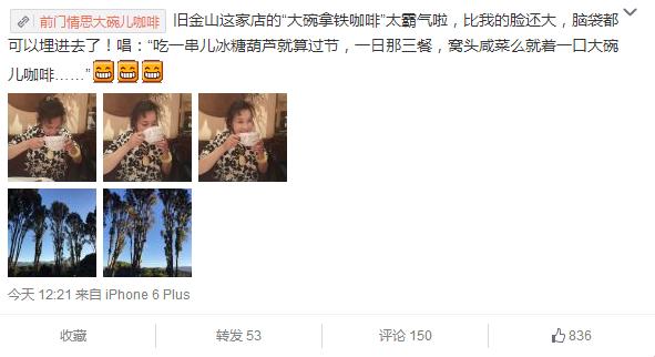 5月21日中午,刘晓庆在微博中晒出自己在旧金山休假的照片,并留言:“旧金山这家店的“大碗拿铁咖啡”太霸气啦,比我的脸还大,脑袋都可以埋进去了!唱:“吃一串儿冰糖葫芦就算过节,一日那三餐,窝头咸菜么就着一口大碗儿咖啡……”微博发出后,网友们再次赞叹已60岁的刘晓庆的“不老容颜”。