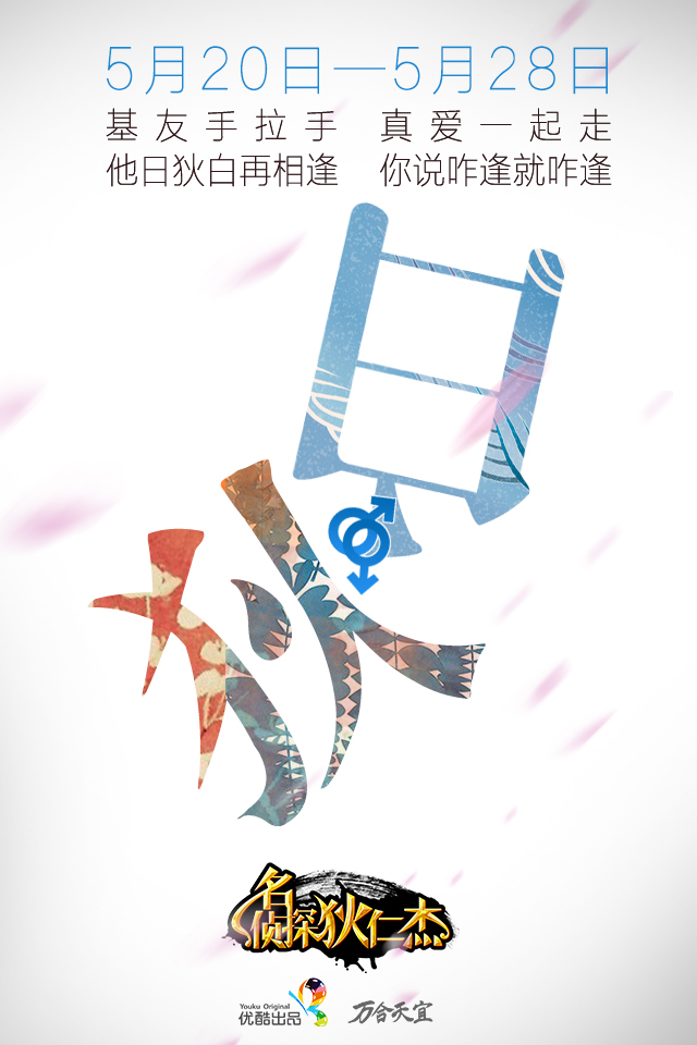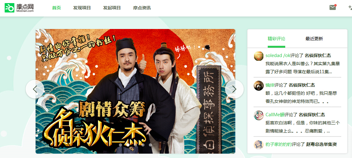 网络情人节“520”当天,优酷出品与万合天宜携手国内知名众筹平台摩点网,开启了名为“全民做编剧,我们听你的”的众筹活动,为时下火爆的网络剧《名侦探狄仁杰》征集剧情创意。这也是国内首次由粉丝助力,为网络剧众筹剧情创意的事件。
