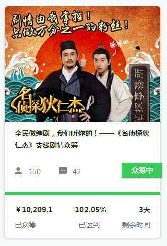 “翻1000次白眼,于是诅咒破解”“集齐七颗龙珠,却召唤出只什么愿望都实现不了的神龙”……这样脑洞大开的情节并非是什么无厘头的动漫作品桥段,而是由时下热播的网络剧《名侦探狄仁杰》的粉丝们合力贡献的剧情创意,更有趣的是:这些创意还将有可能通过众筹的方式成为真正的支线剧情。这种前所未有的创新玩法也使得狄仁杰的粉丝们在网上展开了新一轮的狂欢,不到四天时间众筹便宣告成功。