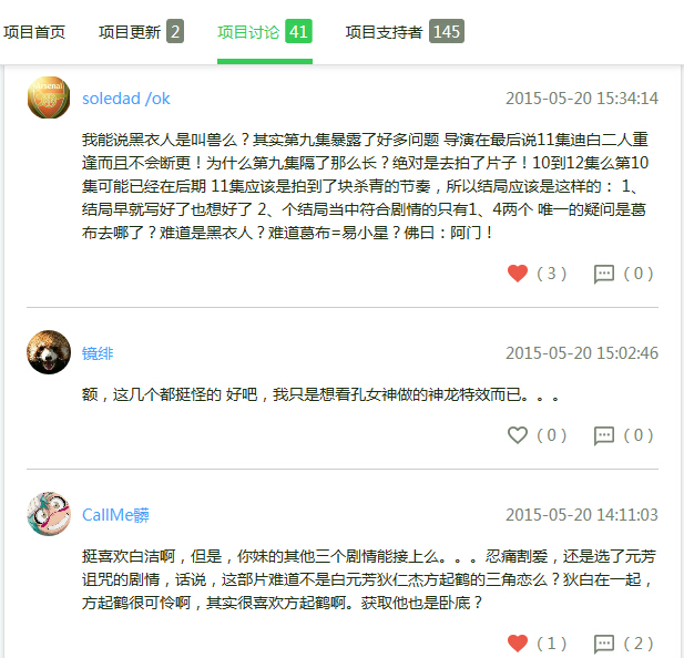 众筹活动上线后,迅速得到了网友和粉丝们的关注与响应,大家纷纷大开脑洞提供了各式各样的奇葩剧情创意,狄仁杰的几位主演也纷纷在微博发声,召集粉丝为喜爱的支线剧情投票。一般说来,众筹事件会持续一到两个月时间,本次众筹由于受拍摄计划的影响,持续时间仅有9天,但这并没有影响到粉丝们的热情——仅仅三天多的时间,众筹的筹资目标便已顺利达成。