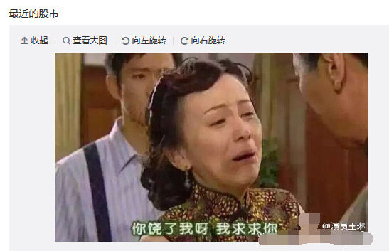 6月26日股市暴跌,不少股民连连叫苦。当天下午,“雪姨”王琳晒出一张自己的剧照,并写道:“最近的股市。”只见剧照上“雪姨”的对白是:“你饶了我吧,我求求你。”