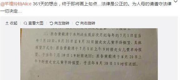 6月26日下午,黄毅清晒出一张与前妻黄奕因女儿探望权而引发纠纷案的法院判决书,判决书上注明黄毅清七八月可以探望女儿的安排。这意味着从下月开始,黄毅清就能见到女儿。