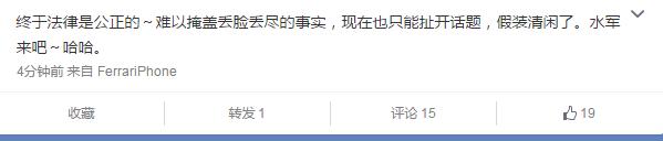 今日晚间,黄毅清再次发文称:“终于法律是公正的,难以掩盖丢脸丢尽的事实,现在也只能扯开话题,假装清闲了。水军来吧,哈哈!”