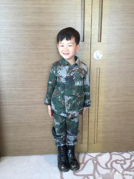 6月27日,王宝强妻子马蓉在微博晒出一组照片,其中一张他们的儿子穿着迷彩,立正站好,帅气可爱,仿佛也跟爸爸一样进入了部队。另一张照片是王宝强深情地吻着马蓉。