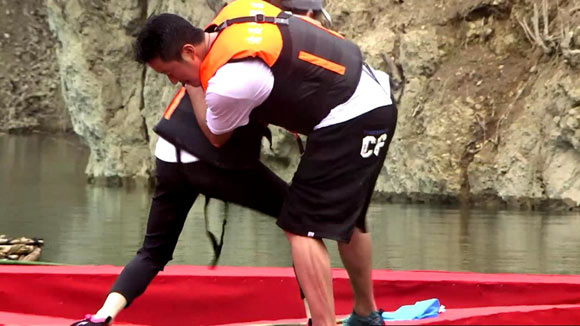 而在接下来的挑战中,李小鹏李安琪运动力全线爆发更是引得众人惊讶。在“五军之战”挑战环节中,飞行棋盘般的五角星型浮台建造在水面上,明星夫妻要在其上站立,每一对都将和其他夫妇狭路相逢,且将对方推落水中后才能前进,并向“敌军”阵营中插军旗。李安琪独当一面站在五十公分宽的木板上,防守前来进攻的“战狼”吴京。一旁观战的郭京飞向安琪敲警钟:“靠近吴京他不会让着你的,他控制不住自己。”但李安琪毫不害怕与吴京“扭打”一团,最终用“内功”将吴京逼入水里。谢楠冲上前扬言要“替夫报仇”,李安琪则不费吹灰之力将前来挑战的谢楠推入水中,谢楠全身被浸湿无奈表示:“这女人太强了。”李小鹏尚未出马李安琪就一挑二获胜,奥运夫妇的竞技实力不容小觑。