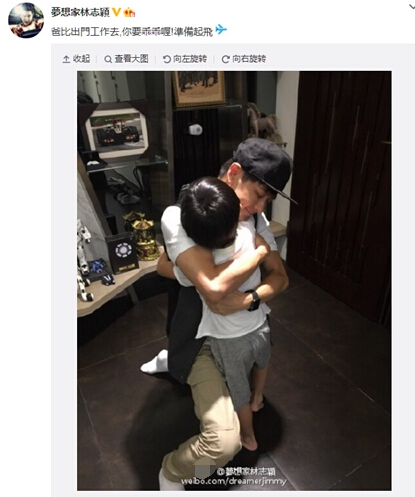 今日,林志颖在微博晒出与爱子拥抱照片,留言称,“爸比出门工作去,你要乖乖喔!准备起飞”。照片中,林志颖身穿白色半袖,半跪在地上,将爱子Kimi抱进怀中,闭眼拥抱。
