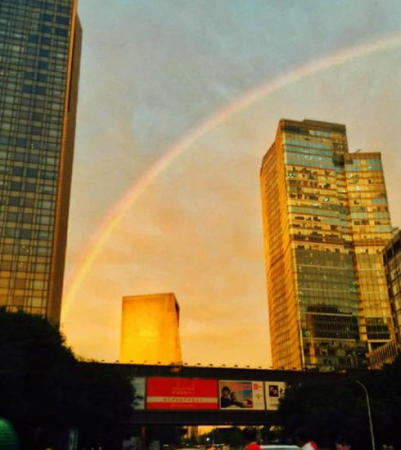 3日傍晚,北京西南天空出现彩虹,不少人都在网上晒出自己拍到彩虹找。3日晚间,李冰冰也通过微博晒出多张彩虹照与自己的美照,并留言称:“听说彩虹天,冰冰色和短裙最配哦。”