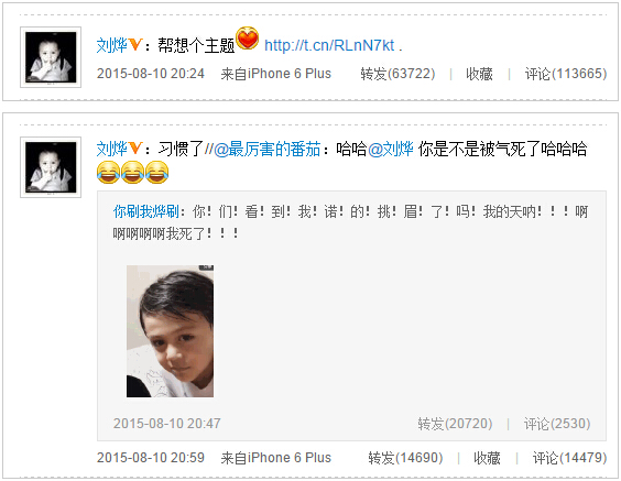 刘烨在微博中写到:“帮想个主题呗”。这一下子,网友纷纷脑洞大开,主题纷至沓来:“一个过气网红与他的当红儿子”、“诺一:我就静静的看着你装逼”、“诺一:我装作不认识他的样子”、“高冷帅哥和他的智障粑粑”、“诺一被爸爸吓面瘫了!”