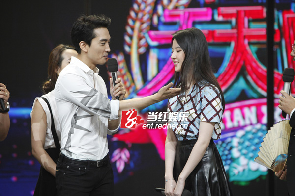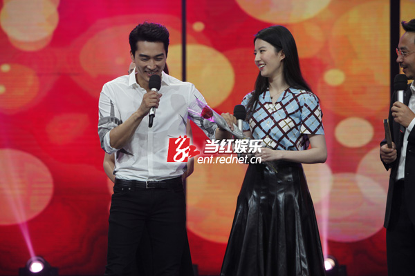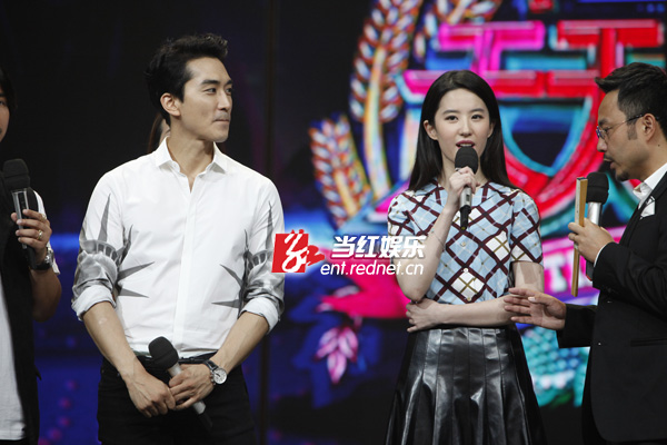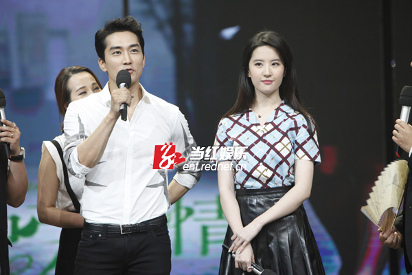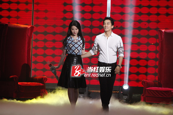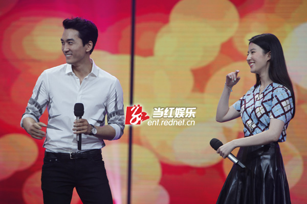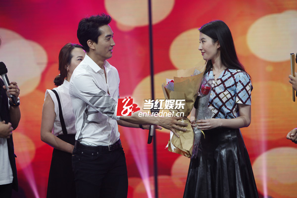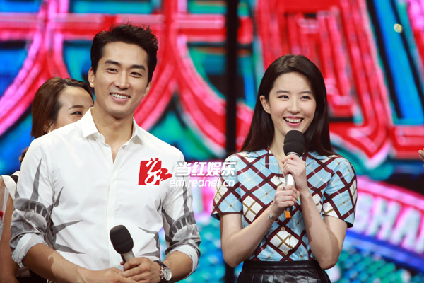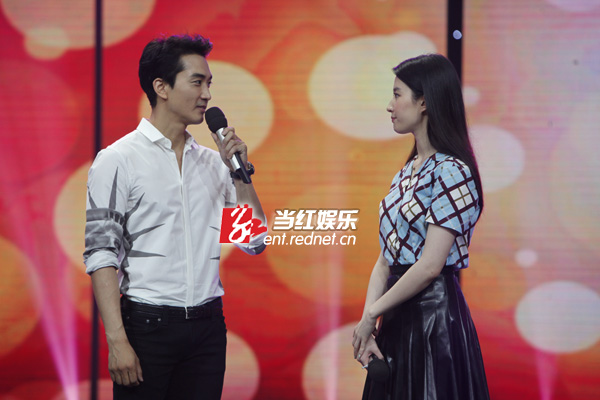 8月12日,宋承宪刘亦菲在长沙录制湖南卫视脱口秀节目《天天向上》为新戏宣传,这是二人自恋情曝光以来的荧幕首秀。现场二人互动频繁,甜蜜值爆表,对于“神仙姐姐”的称号,刘亦菲现场回应:“我很怕‘仙’这个词,我一点也不仙,很真实,还有点‘张牙舞爪’。”而宋承宪则借机真情告白:“其实我不是一个很贪心的人,但看见你之后很想拥有。”两人深情对视,甜蜜的气氛让观众直呼“虐死单身狗”!节目录制后,宋承宪更是在微博上晒出两人录制节目后台的相偎合照,表示:“第一次一起携手出演的综艺节目非常开心!”据悉,该期节目即将在九月份播出。