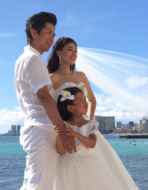 牛莉穿着雪白的婚纱和丈夫女儿一起拍摄婚纱照,一家三口显得十分温馨。