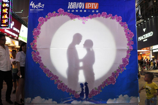 七夕当晚,湖南IPTV除了在咖啡馆举办”我要脱单“七夕单身联谊活动,还在长沙黄兴路步行街中心广场设立“七夕亲吻幕布”,邀请路过的情侣免费合影留念,愿这个唯美的剪影幕布给情侣留下七夕的美好回忆,也为长沙今年的情人节添上浪漫一笔。