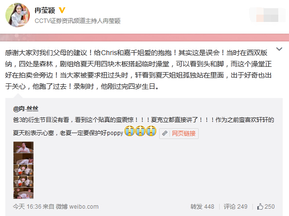 随后,轩轩妈妈冉莹颖于同一天的18点48分转发,并解释道:“感谢大家对我们父母的建议!给Chris和嘉千姐爱的抱抱!其实这是误会!当时在西双版纳,四处是森林,剧组给夏天用四块木板搭起临时澡堂,可以看到头和脚,而这个澡堂正好在拍卖会旁边!当大家被要求扭过头时,轩看到夏天姐姐孤独站在里面,出于好奇也出于关心,他跑了过去!录制时,他刚过完四岁生日。”