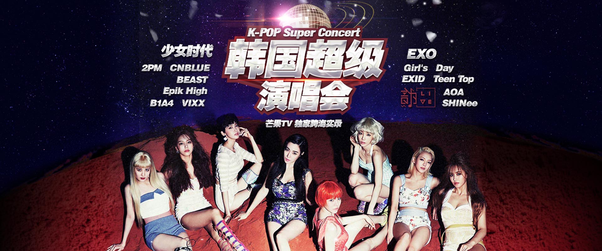 9月5日、6日两场超级演唱会将在韩国盛大开唱,此次演唱会汇集了EXO、少女时代、BEAST、TEENTOP、VIXX、EXID等超豪华韩国艺人阵容。芒果TV将对这两场音乐盛会全程进行独家直播,届时粉丝们可通过芒果TV实时一览明星风采,在线体会这场超级盛宴。