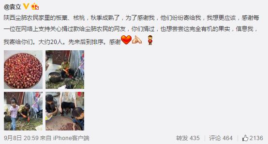 昨天,袁立还在微博寻找捐款人一起分享,称:“陕西尘肺农民家里的板粟、核桃,秋季成熟了,为了感谢我,他们纷纷寄给我,我想更应该,感谢每一位在网络上支持关心捐过款给尘肺农民的网友,你们捐过,也想尝尝这完全有机的果实,信息我,我寄给你们。大约20人。先来后到排序。感谢!”