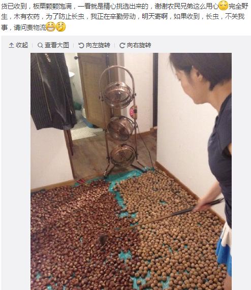 9月9日晚,袁立微博晒家里铺满栗子、核桃的照片,留言称:“货已收到,板栗颗颗饱满,一看就是精心挑选出来的,谢谢农民兄弟这么用心。完全野生,木有农药,为了防止长虫,我正在辛勤劳动,明天寄啊,如果收到,长虫,不关我事,请问责物流!”
