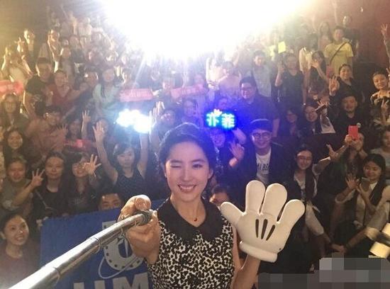 照片中,刘亦菲一手拿着自拍杆,一手戴着米老鼠的大手套,还调皮地闭着一只眼睛和现场的粉丝们玩起自拍,看起来,刘亦菲当天的心情很不错。