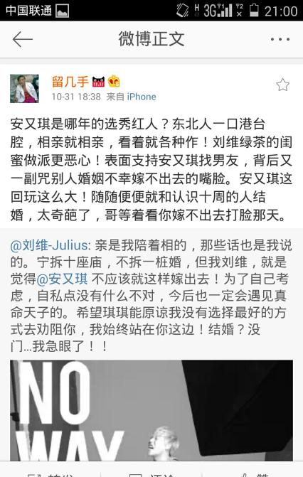 @留几手的这条微博完全不顾谁跟谁,直接把刘维这位苦心闺蜜划到了“绿茶闺蜜”架上,更说其表里不一,丑恶嘴脸。看来手哥这回是真急眼了!可能是因爱生怒,恨嫁不成行,也直指安又琪太奇葩,坐等打脸!小编想说,手哥你的心思我都能懂,但是这般替安又琪恨嫁不能,想必安又琪已经感受到你的“心意”了。