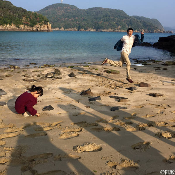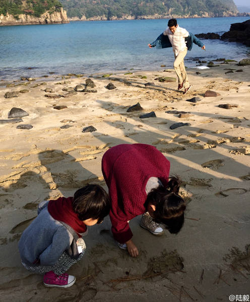 11月9日,陆毅通过微博晒出一组带两个女儿外出郊游的照片,并留言称:“即使娃娃们再忙,也要抽出时间陪老爸郊游”。照片中,陆毅在一旁奔跑,女儿贝儿与妹妹开心玩沙,画面十分温馨。网友看到照片后纷纷留言,“一家四口俄罗斯套娃”、“男神经老爸”、“哈哈,太可爱了”、“全是大长腿”。