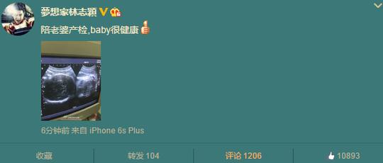 11月30日,林志颖在微博晒出怀孕妻子的B超照,并写道:“陪老婆产检,baby很健康。”