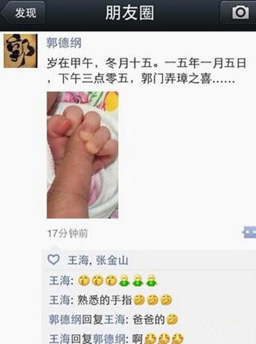 早前通过相声演员赵建明在微博上传的一张照片,现年42岁的相声演员郭德纲被证实喜得二胎,与第一个儿子年龄相差18岁。可谓是老来得子。随后媒体曝光了郭德纲的微信朋友圈截图,网友们纷纷送上祝福。