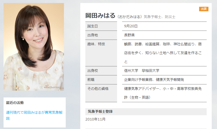2010年秋天,冈田考取“气象预报士”资格。在2011年311东日本大震灾之后,她担任防灾讲座的讲师。她对天气与头痛的关系颇感兴趣,还以“天气痛”为题,担任健康气象建言人。图为冈田生活照。