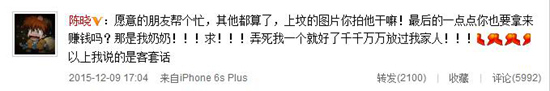 陈晓在微博中写道:“愿意的朋友帮个忙,其他都算了,上坟的图片你拍他干嘛!最后的一点点你也要拿来赚钱吗?那是我奶奶!!!求!!!弄死我一个就好了千千万万放过我家人!!!以上我说的是客套话。”从最后一句可以看出陈晓对祭祖被偷拍的事情非常愤怒。