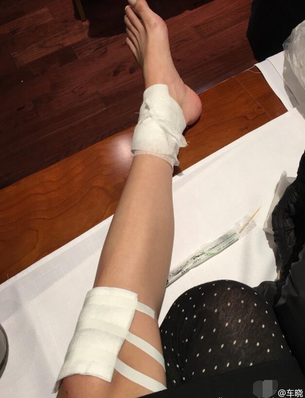 在其中一张照片中,她的脚踝处有明显擦伤,血迹斑斑。在另一张已经进行包扎的照片中,不仅是脚踝处,膝盖也用了一大块纱布进行包扎,可见膝盖处受伤面积更大。