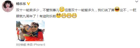 11日,杨乐乐在光棍节更新微博,晒出一张和老公汪涵脸贴脸的照片,并留言称“双十一能卖多少,不管我事儿,但是双十一能爱多久,我们说了算。这不,一眨眼就九周年了!有涵则乐啦。”
