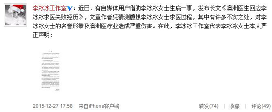 12月27日晚,李冰冰工作室发表严正声明,对此文不实之处进行回应,称文章作者凭猜测臆想李冰冰女士求医过程,其中有许多不实之处,对李冰冰女士的名誉形象及澳洲医疗业造成严重伤害。