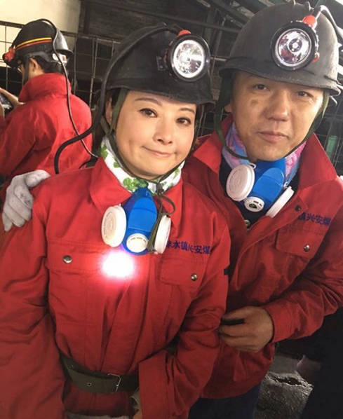 袁立在师傅的指导下体验矿工工作。