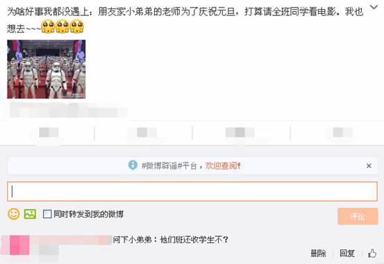 近日,有网友微博曝料:某老师为了庆祝元旦,请全班同学去观看电影星球大战,真是土豪老师啊。网友们纷纷表示,如果我也有这样一位老师就好了;还有网友表示:老师还收学生不?
