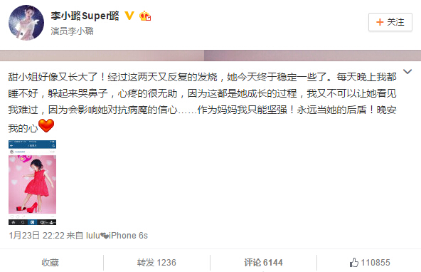 李小璐在微博上晒出甜馨的照片,并说道:“甜小姐好像又长大了!经过这两天又反复的发烧,她今天终于稳定一些了。每天晚上我都睡不好,躲起来哭鼻子,心疼的很无助,因为这都是她成长的过程,我又不可以让她看见我难过,因为会影响她对抗病魔的信心……作为妈妈我只能坚强!永远当她的后盾!晚安我的心。”网友看到后,纷纷估计小甜馨:“小甜馨快点好起来”。还有不少TFboys的粉丝留言“源哥的小迷妹贾女士棒棒哒,这个情敌我喜欢”